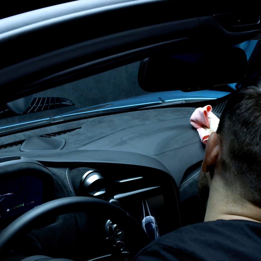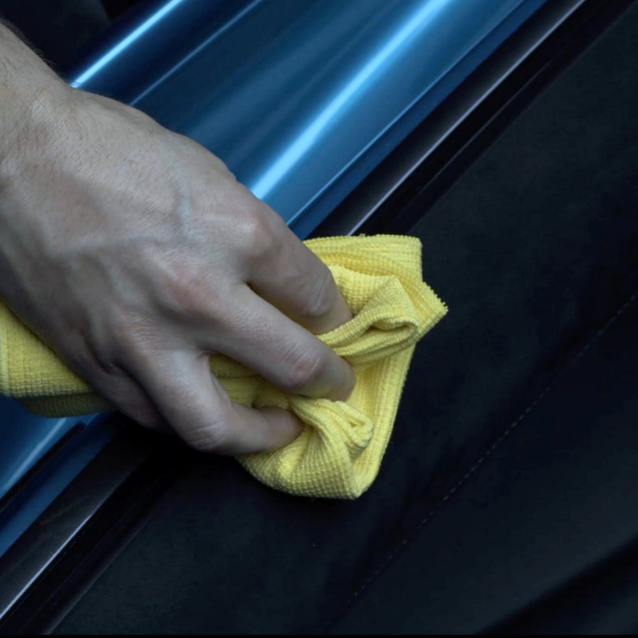 - Spray Swissvax Quick Interior Finish onto a clean Swissvax Micro-Wash microfibre cloth (yellow) and spread evenly.
